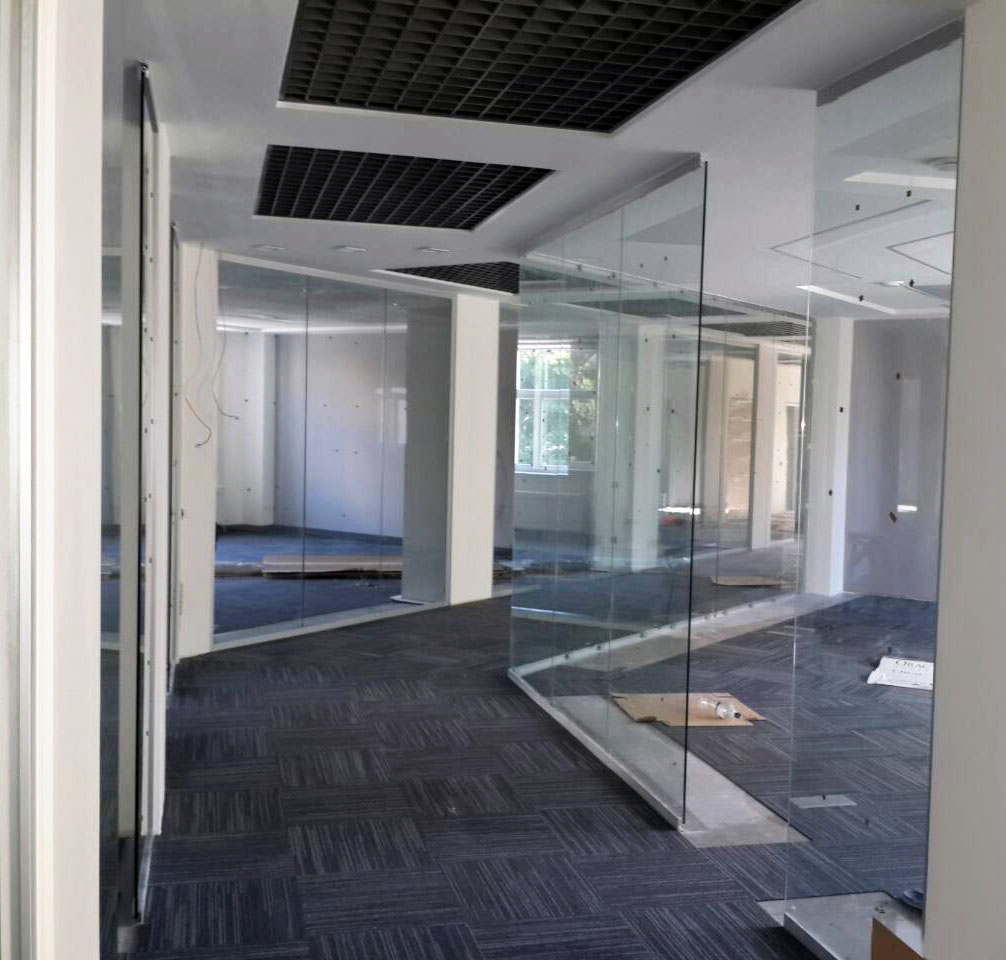 Продолжаются работы по установке стеклянных перегородок в офисном помещении крупной компании в г. Постава.