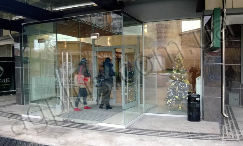 Стеклянные входные группы с ручным открыванием бывают двух видов: распашные и маятниковые.