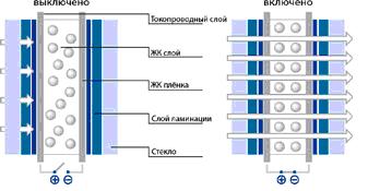 В выключенном состоянии кристаллы располагаются хаотично, образуя непрозрачную бело-матовую поверхность. При подаче напряжения кристаллы мгновенно принимают параллельное, по отношению к электрическому полю, положение, и стекло становится прозрачным, с незначительной опалесценцией, позволяя световому потоку беспрепятственно проникать внутрь помещения.