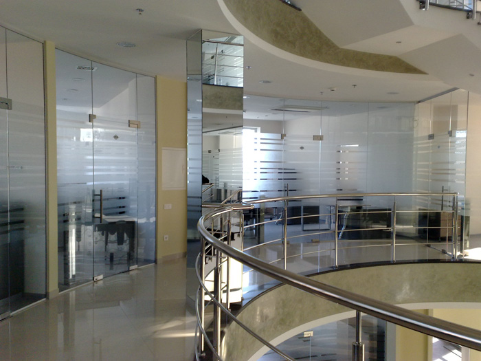 На фото: офісна скляна молірована (гнута) перегородка в офісному центрі "КРЯЖ" у Вінниці.