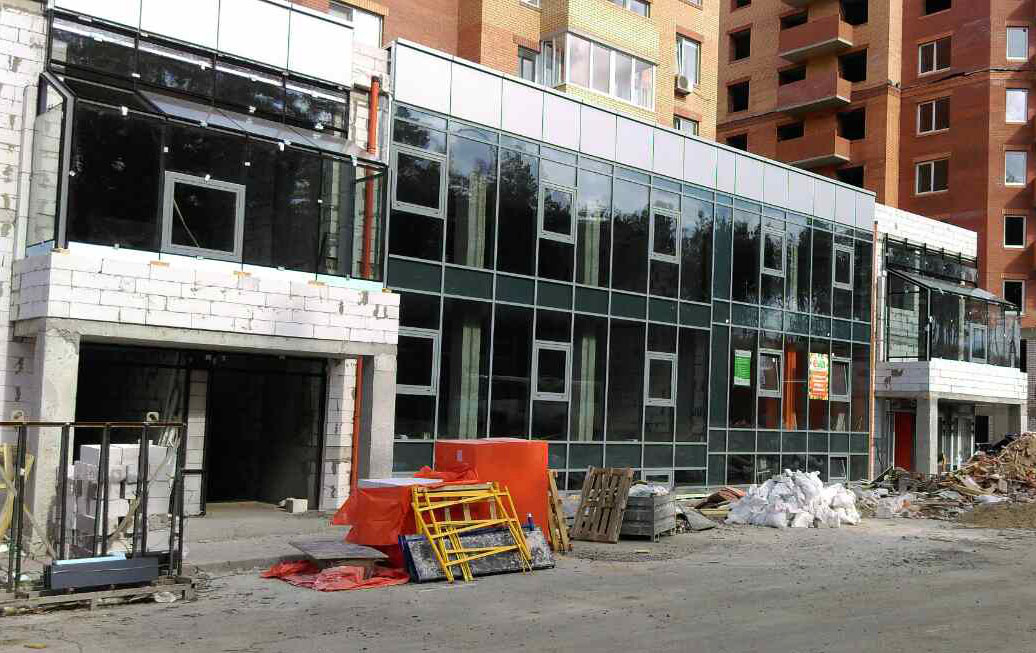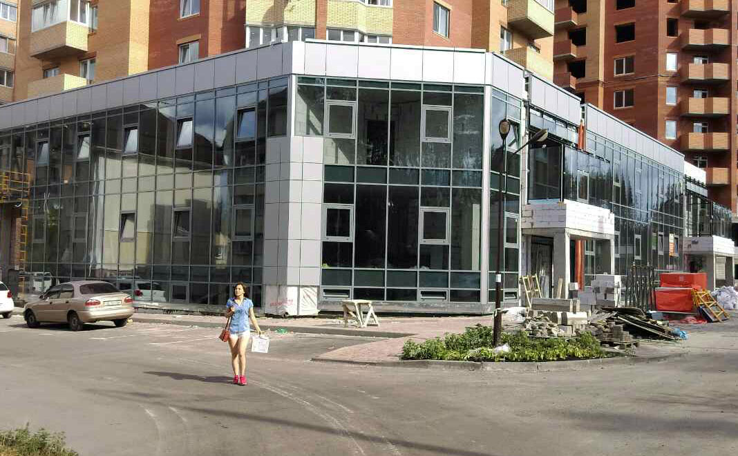 КОМПАНИЯ АГ-ПЛЮС практически завершила обустройство светопрозрачного (СПОК) и навесного вентилируемого фасада в торговом центре "КИЕВСКИЙ" , находящемся в жилом комплексе по ул. Университетской, 2/1, дом 4.в г. Ирпене.