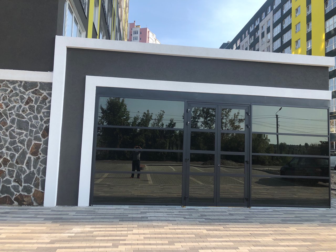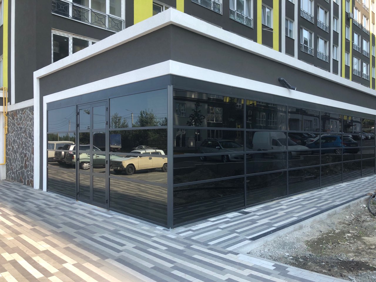 Раздвижные двери из черного закалённого триплекса 6+6 украшают фасад ЖК "Континент" в Буче.