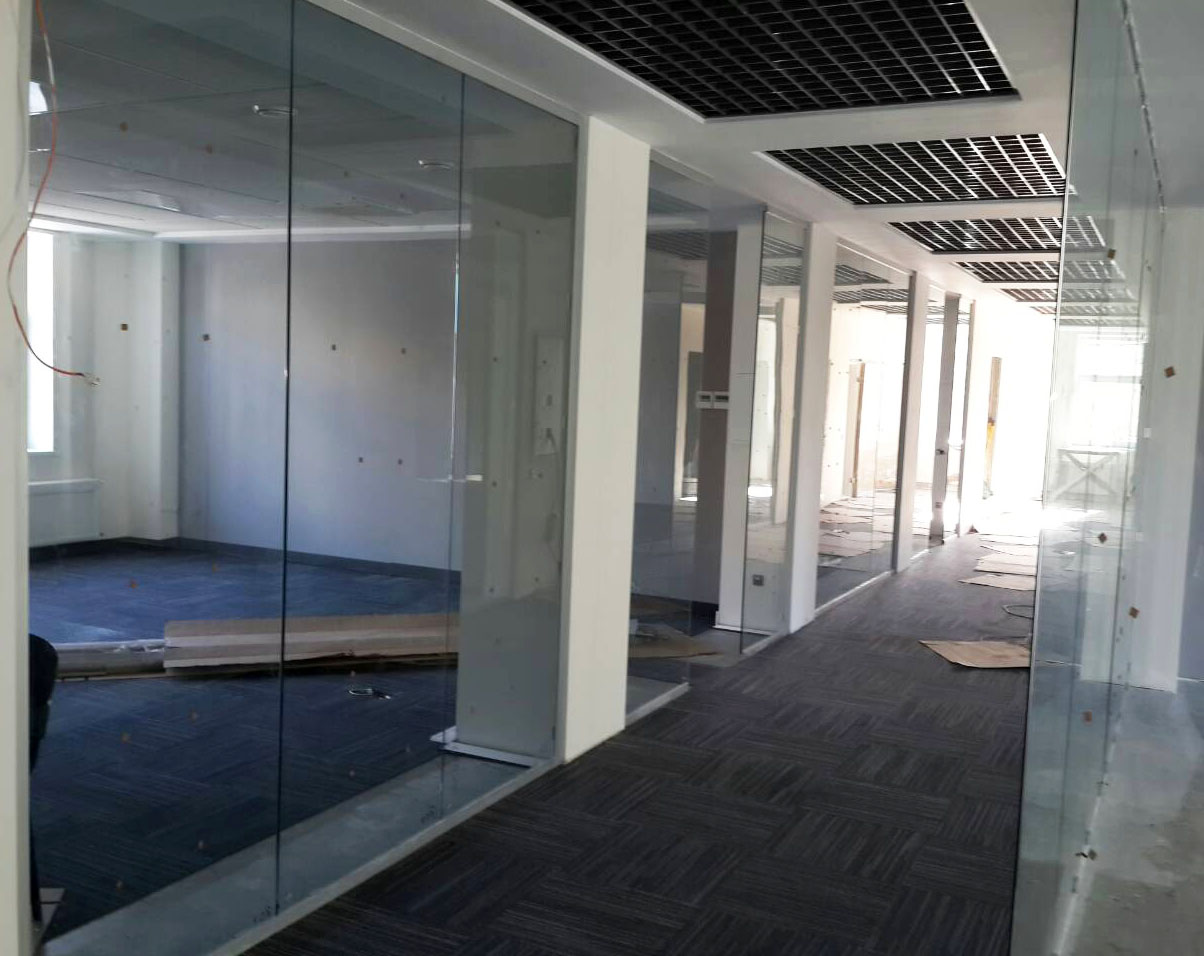 Продолжаются работы по установке стеклянных перегородок в офисном помещении крупной компании в г. Постава.