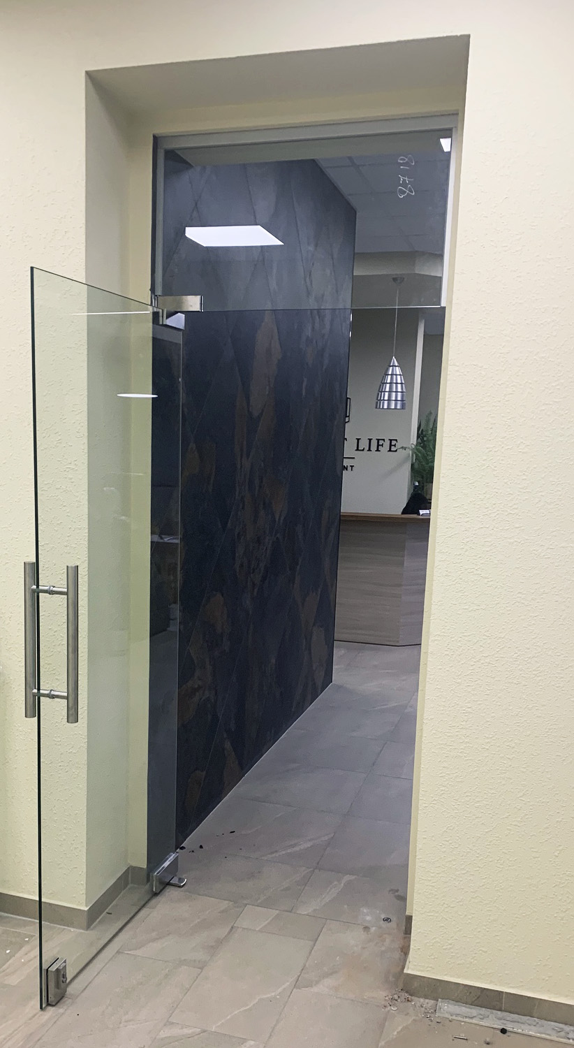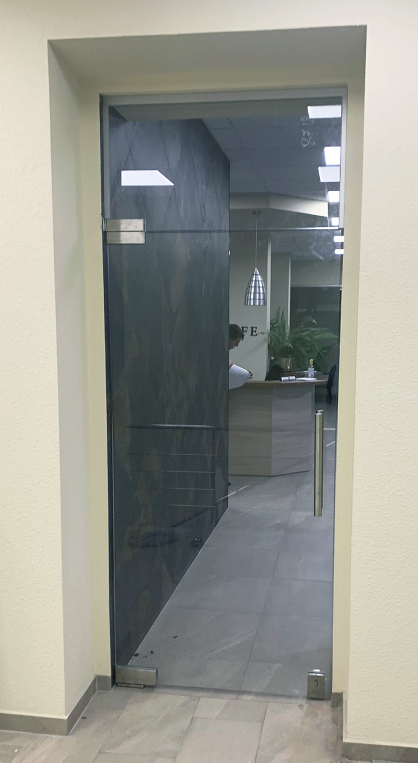 Закончили установку распашных стеклянных дверей с "верхним светом" в офисном помещении в Киеве.