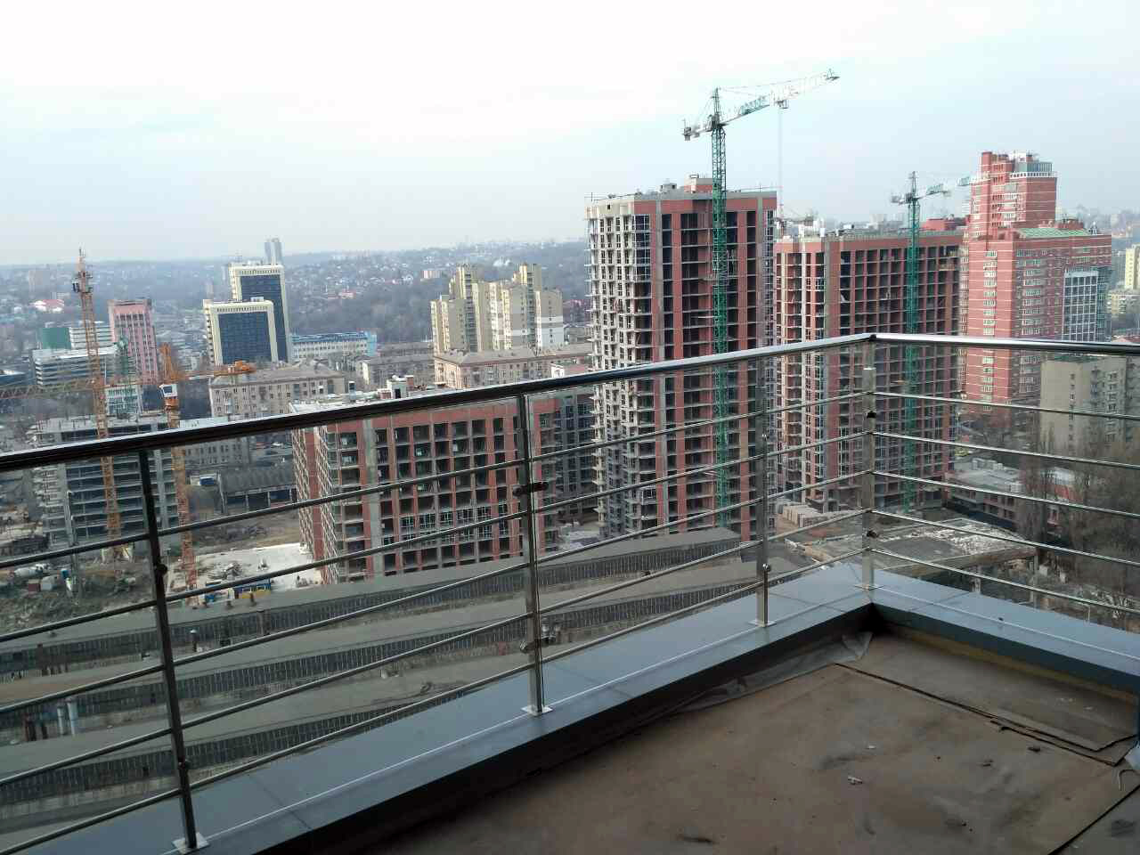 Cтеклянное ограждение балкона (триплекс 4+4, стойки и поручень - труба нерж.) и стеклянные двери изготовили и установили в частной квартире на ул. Кудри в г. Киеве.