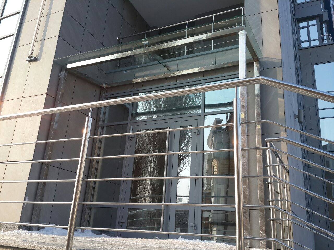 Завершены работы по изготовлению и установке стеклянного козырька в профиле на ул. Кудри, 7 в г. Киеве.