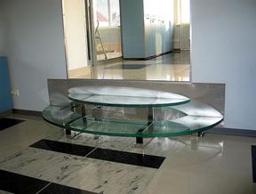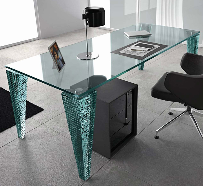 Офісні меблі можна виконати, як з загартованого скла (не менше 8 мм завтовшки) цілком, так і в тандемі з деревом, каменем або металом (наприклад, підніжжя для столиків та столів або каркаси для шаф).