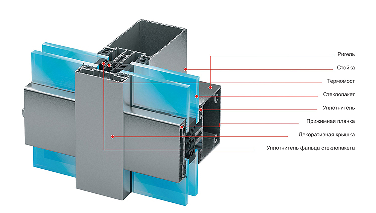 Заповнення в класичному стійково-ригельному фасаді може бути скло, склопакети однокамерні чи двокамерні з використанням загартованого і енергозберігаючого скла шириною 50 мм і товщиною 24-32 мм.