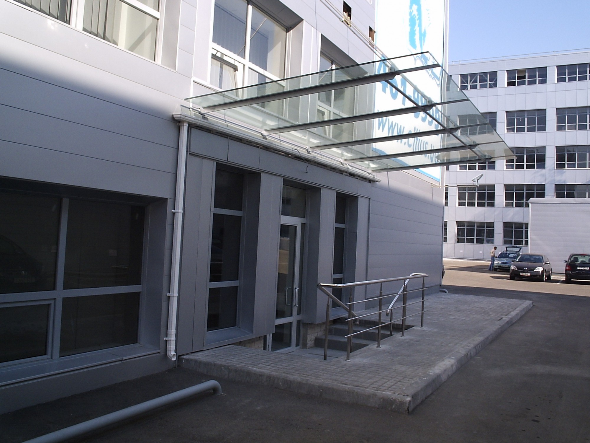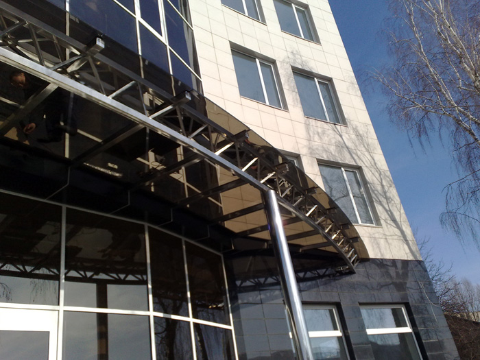 Козырьки, расположенные на фасаде здания, надежны и практичны в эксплуатации, выполнены из закаленного стекла (прозрачного или тонированного в массе), триплекса или моллированного (гнутого) стекла.
