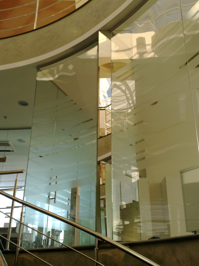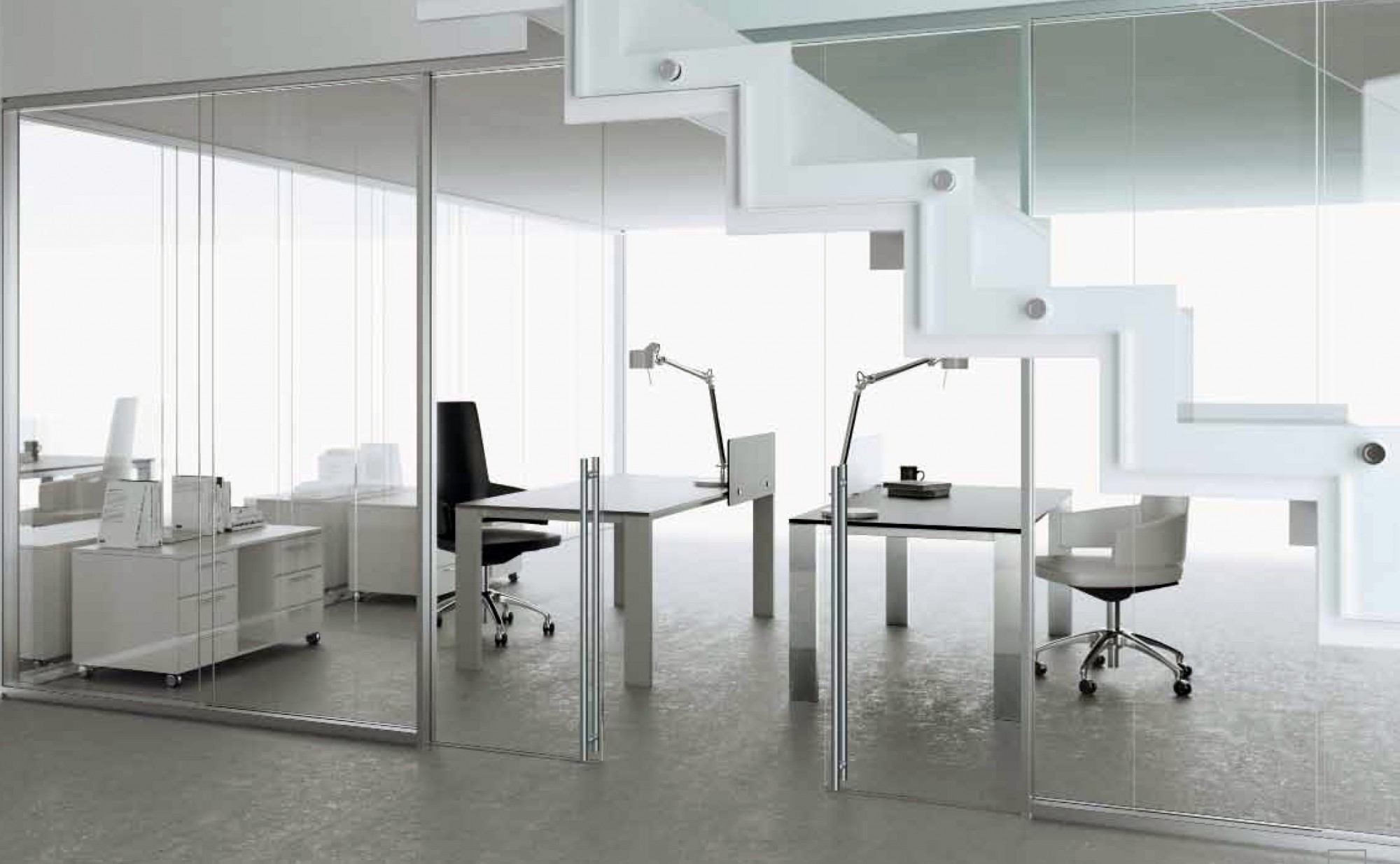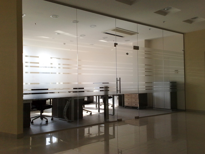 Перегородка из стекла, при своей видимой хрупкости, очень надежна и красива. Стеклянные части перегородок выполняются из разнообразных видов стела: прозрачного, тонированного в массе, матового, на него можно наносить всевозможные рисунки по технологии художественного пескоструя и фотопечати, украшать логотипами компаний.
