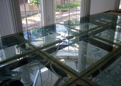 При активном использовании стеклянного пола рекомендуется применять "накрывное" стекло, чтобы при износе верхнего стекла не менять весь пол, а заменить только его. Такая методика делает стеклянный пол практичным, с большим запасом прочности.