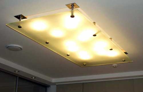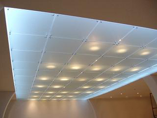 Стеклянные подвесные потолки позволяют создать любые цветовые и световые эффекты при помощи люминесцентных, светодиодных или точечных светильников.