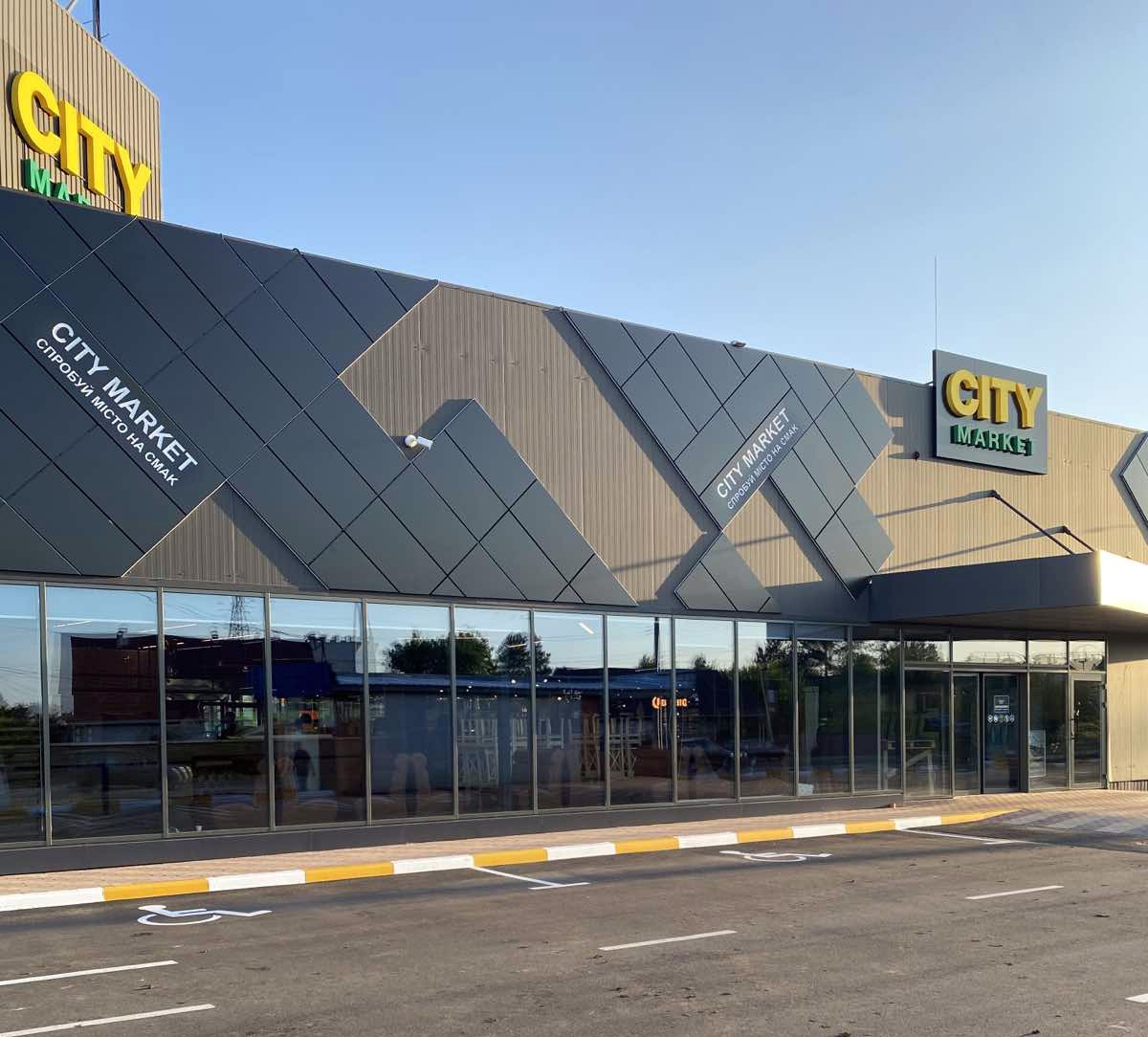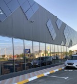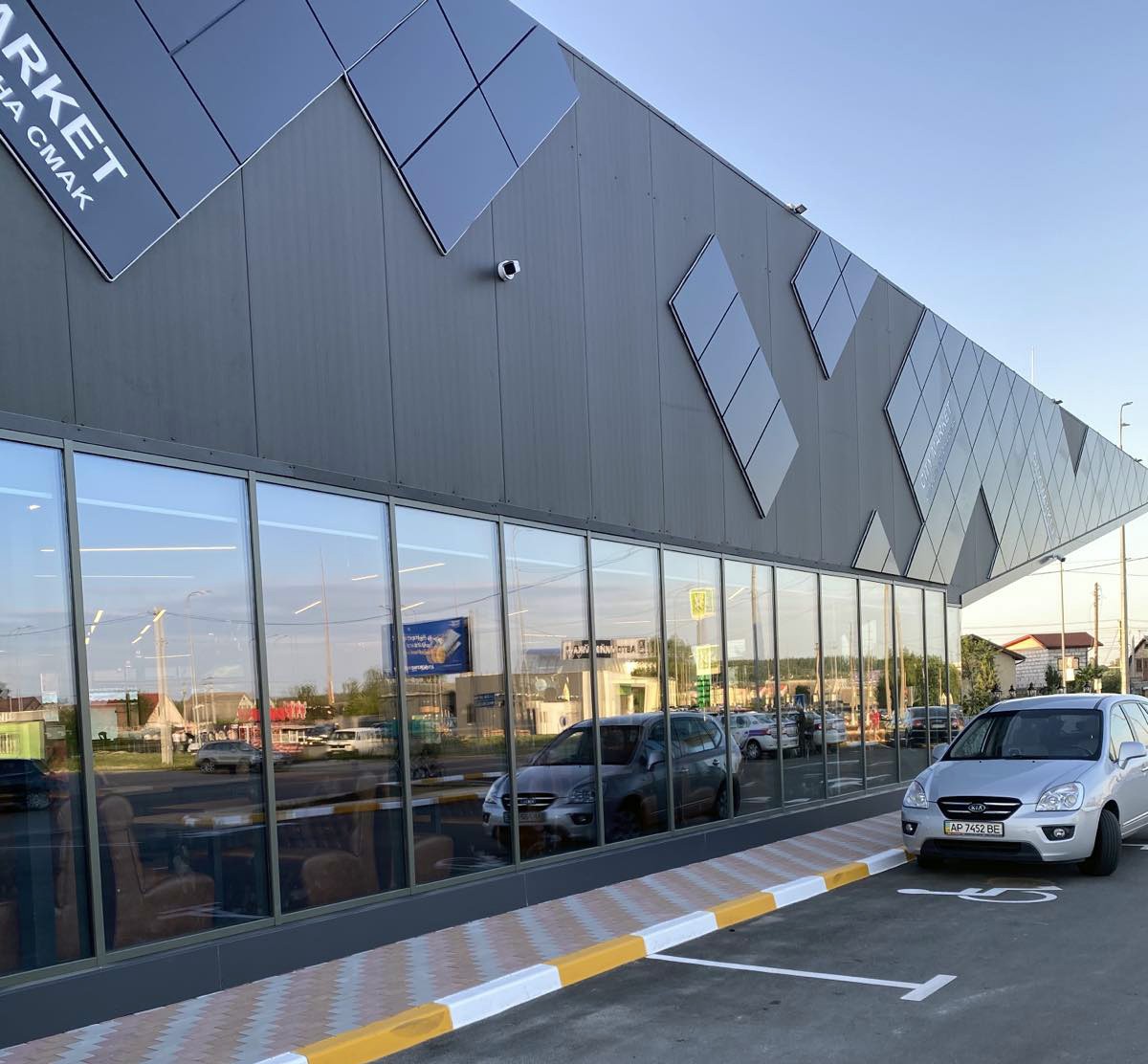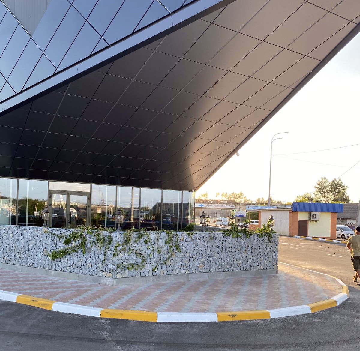 Стеклянный фасад, раздвижная входная группа, обшивка козырька композитом, стеклянная перегородка.