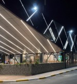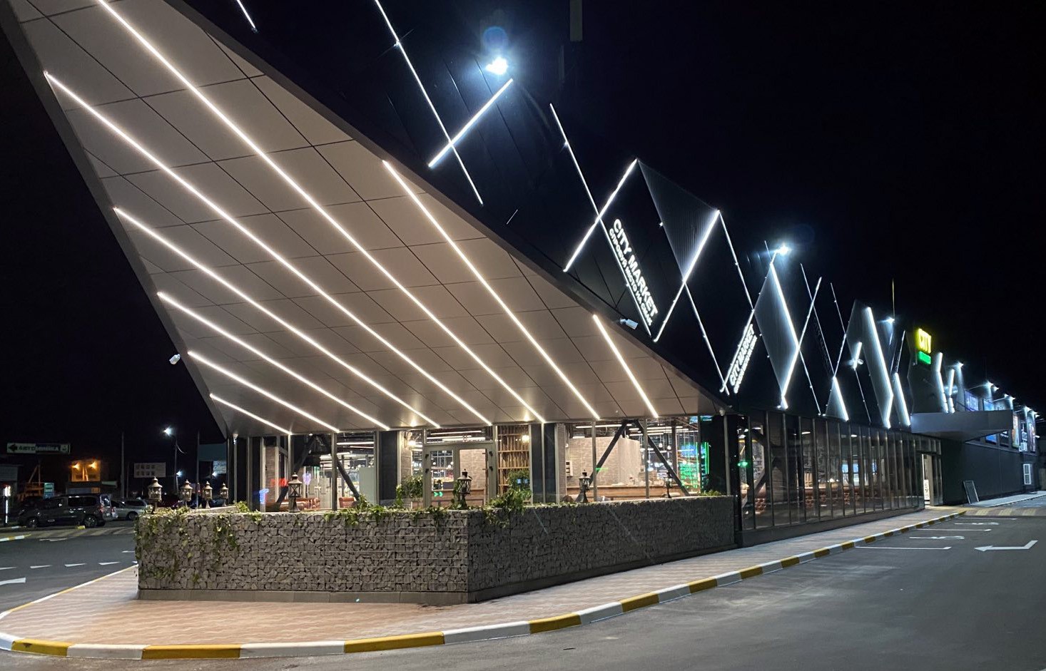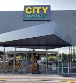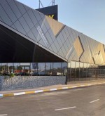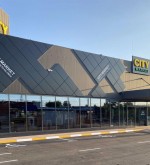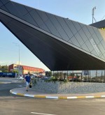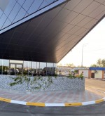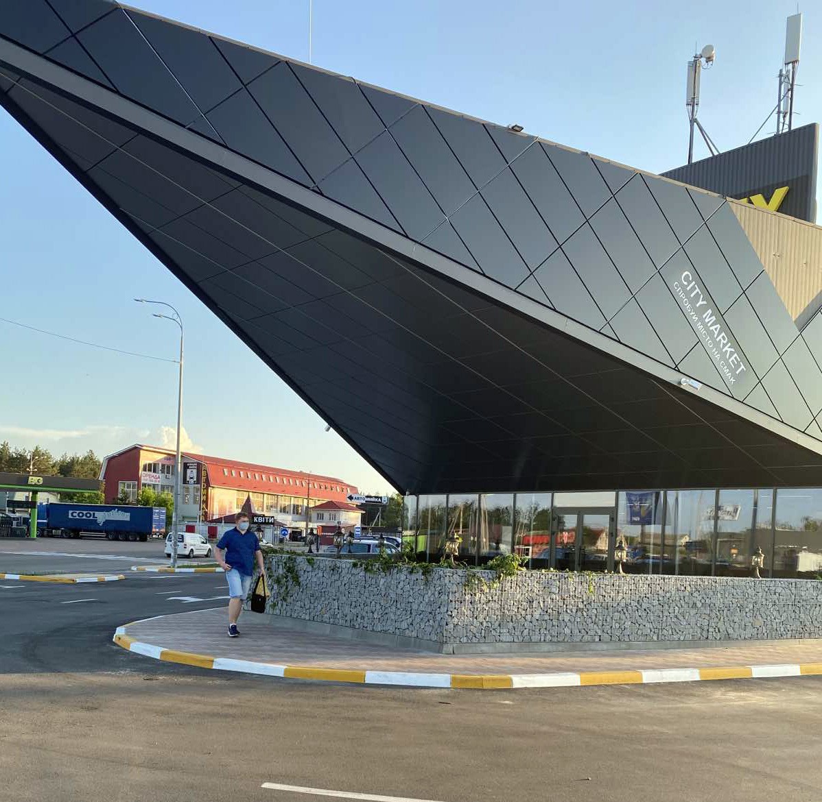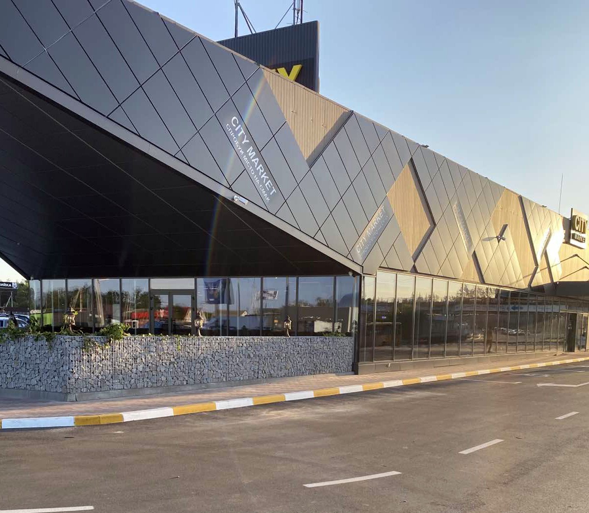 Стеклянный фасад, раздвижная входная группа, обшивка козырька композитом, стеклянная перегородка.