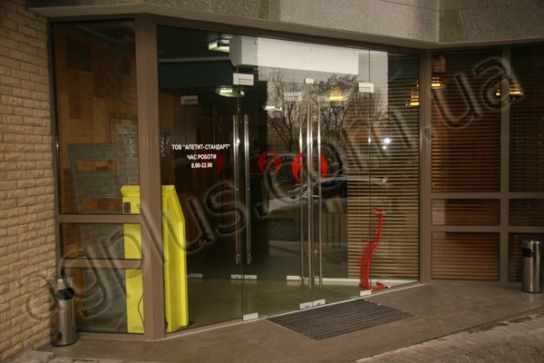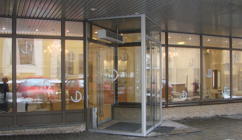 Распашные одно- и двустворчатые двери, как правило, устанавливают в небольших магазинах, торговых точках с малым потоком людей. Маятниковые двери применяются в сочетании с тамбуром или двойной ниткой остекления. Выбор маятниковых дверей обусловлен средним потоком людей.